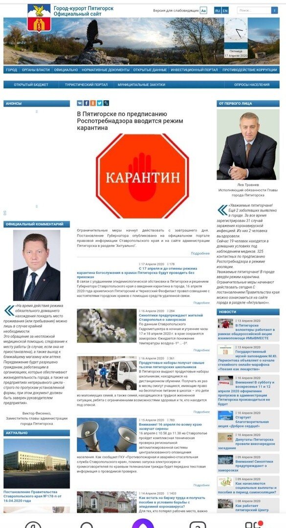 Итак, с сегодняшнего дня, 17 апреля, в нашем городе Пятигорске официально введен карантин. Местное правительство объяснило это сложной эпидобстановкой, а именно «высокой динамикой заболевания» (за последние сутки у нас зафиксировано 23 заболевших против 1-5 в соседних населенных пунктах). До этого дня в нашем городе, как и в других городах, был режим самоизоляции, который, честно говоря, никто особенно не соблюдал, из-за чего, по словам губернатора нашего края, и появилось столько заболевших. Первым шагом стало освобождение от должности мэра города, вторым- издание Постановления о введении карантина. Какие же новые ограничения появились с его введением? Во-первых, закрыли въезд в город и выезд из него. Появились КПП, на которых у всех проверяют документы, и впускают только тех, у кого имеется специальный пропуск, а это, согласно Постановлению, «служебные транспортные средства Минобороны, МЧС, правоохранительных органов и организаций, деятельность которых является критически важн