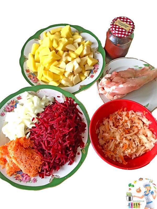 Готовим борщ с квашенной капустой. Пошаговый рецепт с фото. Ингредиенты для борща с кислой капустой. В кастрюле варим мясо и разделяем его на куски. Можно мясо разрезать заранее. Через 30-40 мин добавляем картошку и соль. Готовим пережарку с томатной пастой. 1 ст. ложка После того как лук и морковь немного обжарились добавляем квашенную капусту. Перемешиваем. В последнюю очередь в сковороду добавляем свеклу натертую на терке. На медленном огне 5 минут пассируем. Потом перекладываем в кастрюлю. Добавляем специи. Перец душистый, перец черный, кориандр. По необходимости добавить соли и кладем укроп по вашему вкусу.. Борщ готов. Ещё три рецепта приготовления борща. Борщ с яблоком. Борщ без капусты. Индекс борща май 2019. Московская область. Видео рецепт.