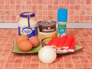 Смешать кукурузу (воду слить), крабовые палочки, лук, яйца.