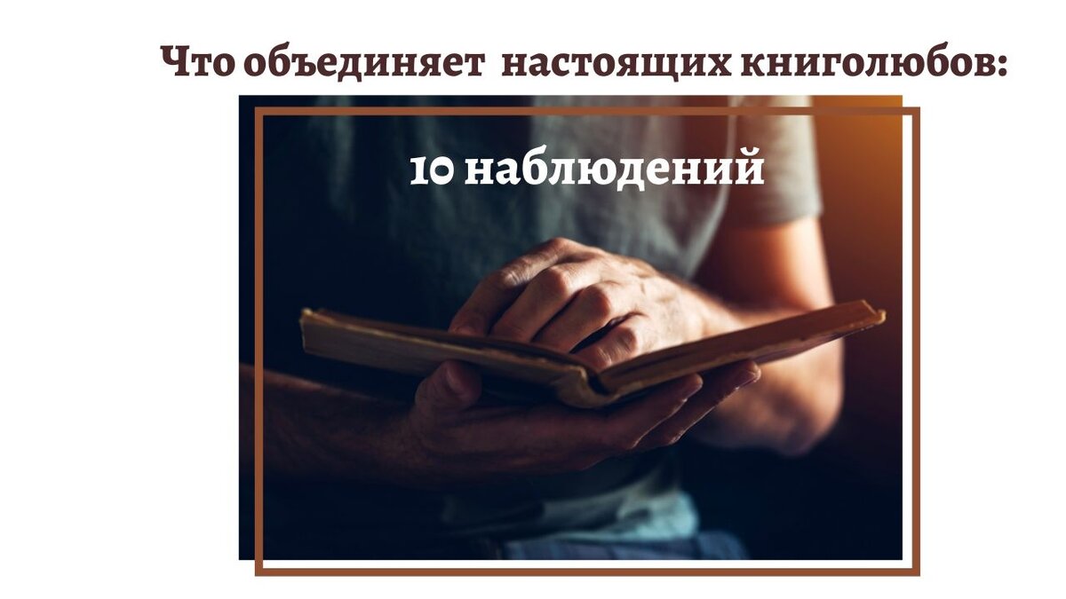Есть что-то, что отличает людей, а есть то, что объединяет. У людей, любящих книги так же есть общие черты. Мы подготовили для вас список наблюдений, в которых каждый книголюб без сомнения узнает себя. 1. Для истинного книголюба запах новой книги ни с чем не сравним. 2. Книголюб предпочитает остаться наедине с книгой, нежели посещать шумные людные места. 3. У книголюба всегда найдутся деньги на новую книгу, даже если придется сэкономить на чем-то другом. 4. История, изложенная на странице книги, становится частью жизни книголюба. 5. Ненамеренно, а часто и намеренно книголюб «присваивает» привычки, высказывания, а порой и образ мыслей героев книги. 6. Истинный книголюб не может уснуть, пока не прочтет несколько страниц своей настольной книги. 7. При переезде или ремонте один вопрос больше всего заботит книголюба: куда уместить все свои книги? 8. Ни один книголюб не может равнодушно смотреть кино, снятое по его любимой книге. 9. Каждый книголюб хоть раз да проезжал нужную остановку, з
