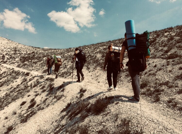 Увидев что Миша и Даша довольно сильно отстали, я предложил ребятам их подождать, тем временем немного передохнув и попив воды. Чтобы разгрузить плечи, я стоял опершись грудью на палки, нагнувшись к земле, невольно изучая меловую крошку под ногами. В аналогичной позе застыл Иван. Шрайнер же снял рюкзак и уселся на обочину, разглядывая свои обветренные ладони.