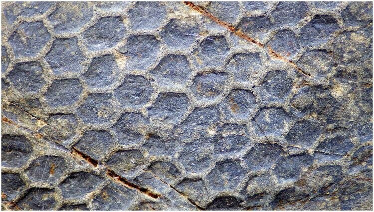 Палеодиктион - органическая структура, которая представляет идеально правильную сетку с шестиугольными ячейками размером от 1 до 3 см. На фото видны доисторические останки такой структуры.