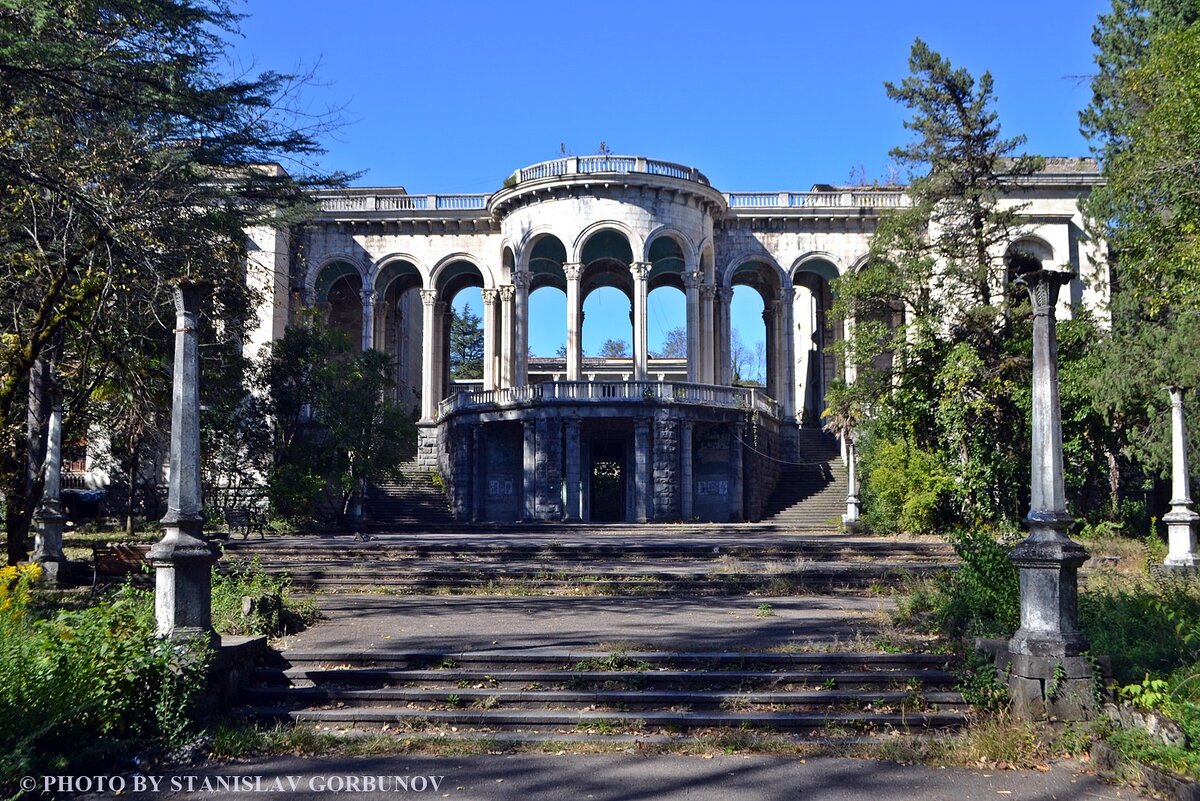 Запущенное здание всё ещё хранит следы былой роскоши, хотя теперь здесь живут абхазские беженцы, а внутренний дворик завален мусором. Отличное место для фотосессий в постапокалиптической атмосфере.