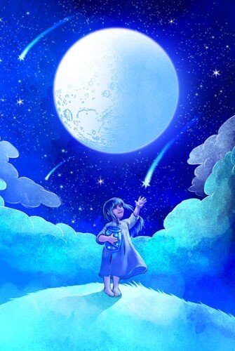 Жила была девочка Василиса. Она часто задавала себе вопрос: из чего сделана Луна- из сыра или мороженого? Ей очень захотелось увидеть Луну близко- близко, дотронуться до неё и точно узнать какая она. Однажды вечером Василиса решилась. Она взяла рюкзачок: в него положила тёплую кофту, булочку, немного воды и вышла на улицу. Девочка сразу же увидела луну: та мерцала белым светом над большим холмом. - Точно, - засмеялась Василиса, - я поднимусь на холм и дотянусь до неё. Дорога была крутой, но освещённой кружочком Луны. Пахло мокрой травой и почему-то марципаном. Наконец Василиса оказалась на вершине холма. До Луны нужно было немного дотянуться. И вот... - Ах! - сказала девочка и дотронулась до серебрянного диска. Но вдруг... что-то отделилось от Луны, какой-то белый комочек. Он дотронулся до Василисы, и она вдруг стала окруженная невиданным сияньем. - Как красиво! - только и произнесла девочка. Всё вокруг мерцало и переливалось. Казалось, что трава живая, небо волшебное, а сама Василиса-