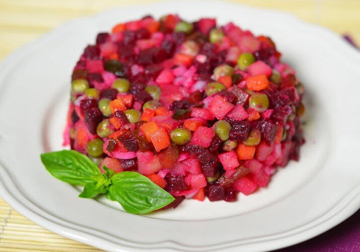 Винегрет — наш привычный и любимый, овощной, полезный и достаточно диетический. При этом он сытный, в отличие от салатов, которые состоят только из зелени. А это значит, что он позволит вам кушать меньше и ваша фигура обязательно вас отблагодарит. В данном рецепте предлагаем попробовать его в новом образе — с пикантной заправкой, которая подарит ему новые оттенки вкуса. Ингредиенты: Для заправки: Приготовление: Для начала замаринуем лук, чтобы не был таким острым и не отвлекал на себя все вкусовые рецепторы. Для этого мелко нашинкуем его и зальем 1 стаканом охлажденной кипяченой воды, добавим в нее чайную ложку сахара и 2 чайные ложки бальзамического уксуса (можно взять обычный 9%). Размешаем и оставим настаиваться. Картофель, огурчики, свеклу и морковь нарежьте кубиками примерно одинакового размера, смешайте их в одной большой миске. Туда же отправим капусту, консервированную фасоль, зеленый горошек и зелень. Консервированную фасоль перед употреблением рекомендуем промыть от вязкой ж