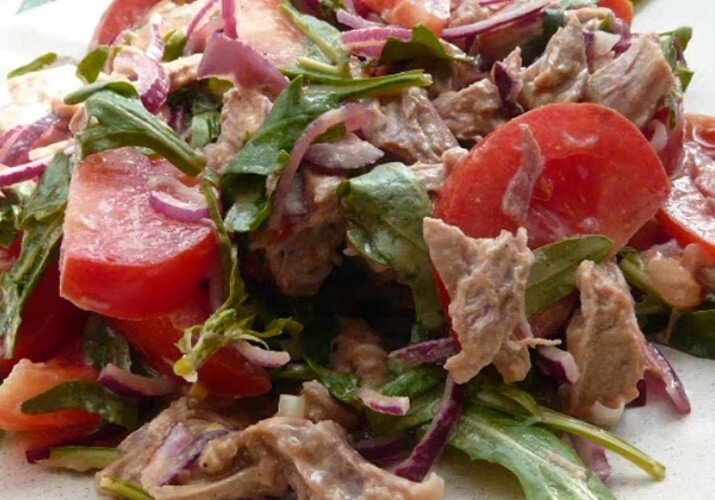 Давайте попробуем приготовить вот такой мясной вариант. Он особенно подойдет к тем, кто хочет похудеть, но еще не пришел к тому, чтобы есть одну зелень. Когда хочется чего-то посытнее, с мясом, и при этом не хочется набрать лишние килограммы. Ингредиенты: Заправка Начнем с приготовления заливки: возьмите одну ложку горчицы, смешайте с лимонным соком, посолите и поперчите по вкусу. Тонкими полукольцами порежем красный лук. Говядину разделить на волокна и нарезать кусочками. Помидоры режем дольками. Можно вынуть сердцевину, чтобы они не давали слишком много воды. Рукколу нарвем руками. Соберите салат, заправьте. Сытно и полезно!