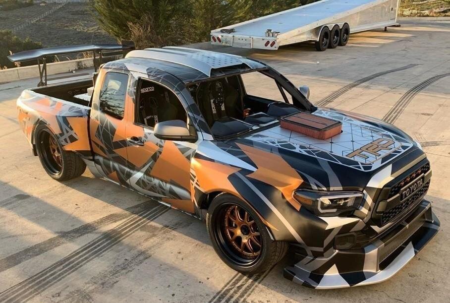 Творение принадлежит подразделению Toyota Racing Development (TRD) из США. За основу взят пикап Toyota Tacoma. Вот только от него остались узнаваемыми только очертания передней части да кабина. Арки существенно увеличили, дорожный просвет занизили. Корпус получил эффектный дрифтовый обвес. Машине поставили новые бамперы и габаритный задний спойлер. Преобразования коснулись и движка: здесь свое место занял V8 TRD – такой, что входит в оснащение гоночных авто серии NASCAR. Отдача движка составляет 900 л.с. Инженеры дополнили мотор новым мощным воздушным фильтром. Весь проект занял 90 дней.