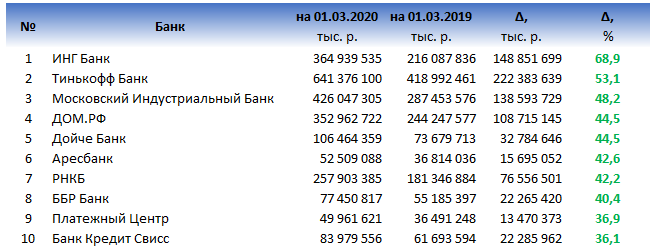 Приветствую читателей нашего канала. В этой статье Вы узнаете кто из российских банков, входящих в ТОП-100 (по активам) совершил прорыв, прирастив объем активов, а также у кого из банков существенно снизился данный показатель. Начнем с хорошего, в ТОП-10 по приросту активов заняли следующие Банки. Хорошие результаты Тинькофф Банка и Банка ДОМ.РФ (прирост на 53,1% и 44,5% соответственно) вряд ли кого-то удивят, а вот Аресбанк точно впечатлил, он умудрился прирасти на 42,6%. Наибольший вклад в прирост активов Аресбанка внесли остатки на счетах предприятий и организаций - 19,7 млрд. р. Обратим взор на аутсайдеров нашего рейтинга. Довольно неожиданно плохие результаты показали Связь-банк и Банк Восточный (снижение активов на 23,6% и 18,5%). Мы проанализировали относительные показатели прироста / снижения активов банков с 01.03.2019 по 01.03.2020. Рассмотрим теперь абсолютную динамику активов в рублях среди крупнейших российских банков ТОП-100. Ну, в лидере ни кто не сомневался, а вот ли