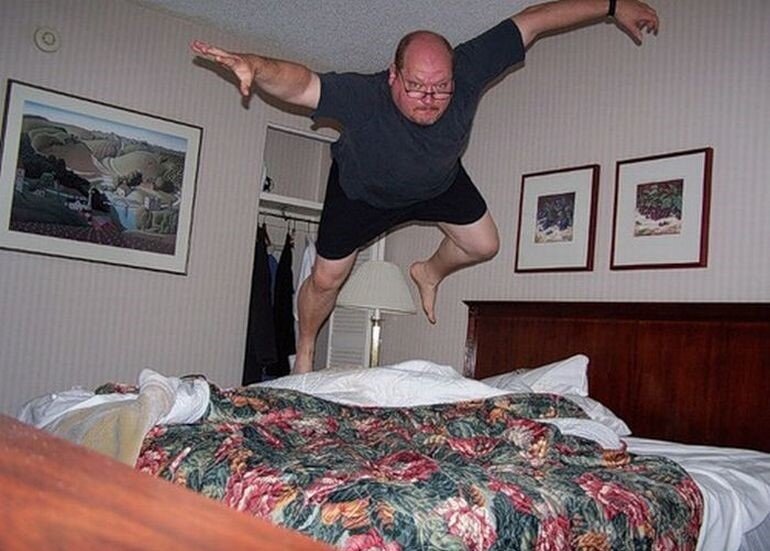 Наше тело гораздо умнее наших мозгов. Если близко стоит кровать с тумбочкой или кресло, тело не разрешает прыгнуть далеко, чтобы не врезаться, чтобы не потерять равновесие. И не разрешает с большим запасом. Чтоб наверняка. Вероятно, в школах сп