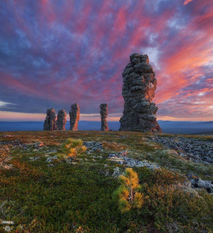 Столбы выветривания (мансийские болваны) — геологический памятник, расположенный в Троицко-Печорском районе Республики Коми на территории Печоро-Илычского заповедника на горе Мань-Пупу-нёр («Малая гора идолов» в переводе с языка манси), в междуречье рек Ичотляга и Печоры. С этим необыкновенным место связано множество легенд. Столбы считаются одним из семи чудес России. Находятся Столбы выветривания довольно далеко от обитаемых мест. Добраться до них — уже в некотором смысле подвиг. Для этого, кстати, необходимо получить пропуск у администрации заповедника. Со стороны Свердловской области и Пермского края есть пеший маршрут, со стороны Республики Коми — автомобильный, водный и пеший маршруты. Около 200 миллионов лет назад на месте каменных столбов были высокие горы. Дождь, снег, ветер, мороз и жара постепенно разрушали горы, и в первую очередь слабые породы. Твёрдые серицито-кварцитовые сланцы разрушались меньше и сохранились до наших дней, а мягкие породы были разрушены выветриванием