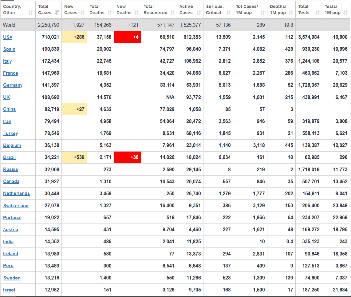 Ситуация в России За минувшие сутки коронавирусная инфекция диагностирована у 4785 человек в 79 регионах России. В десятке регионов с самым большим числом новых пациентов - Москва (2649, вчера было 1959), Подмосковье (482), Санкт-Петербург (139), Мордовия (62), Чечня (60), Нижегородская область (69), Ставропольский край (64), Тверская область (59), а также Краснодарский и Красноярский край (по 45). Всего в стране зарегистрировано 36 793 заболевших во всех 85 регионах За сутки из российских больниц выписали 467 человек, которые успешно вылечились от коронавируса. Общее число выздоровевших выросло до 3057. По данным специалистов, также за сутки зафиксировано 40 летальных случаев. Общее число жертв COVID-2019 в России с момента начала эпидемии - 313 человек. Ситуация в США США – первая страна в мире по распространению коронавируса. По последним новостям на 18 апреля 2020 года, там зафиксировано 702 164 случая заболевания, 37 054 человека скончались, 59 630 человек выздоровели. В стра