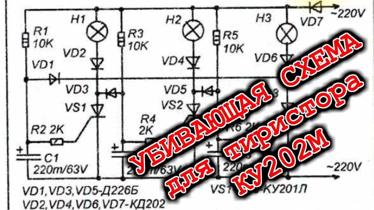 Только на первый взгляд может показаться, что нет никакой разницы при подключении Тиристора КУ202М к нагрузке. Но, учитывая, что данный тиристора разработан был для управления Лампами накаливания и Мощными активными нагрузками, придется поразмыслить о том, как выполнить требования прописанные в описании. Управляющий переход не запираемого тиристора КУ202М очень уязвим к превышению тока и легко выходит из строя при несоблюдении норм схемотехники. Как современные так и старые схемы, публикуемые в журналах, часто содержат ошибки из за которых в любой момент тиристор может получить ток на свой управляющий переход более нормы и сгореть. Что