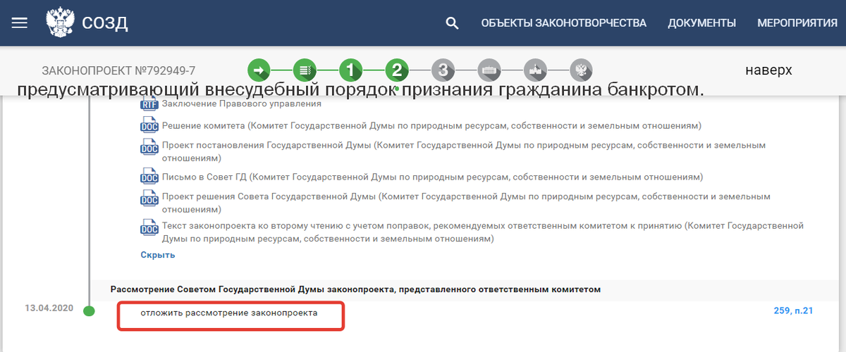 13.04.2020 ГОС/ДУМА ВО ВТОРОМ ЧТЕНИИ ЗАКОНОПРОЕКТА https://sozd.duma.gov.ru/bill/792949-7 РЕШИЛА ОТЛОЖИТЬ РАССМОТРЕНИЕ ЗАКОНОПРОЕКТА. Остаются вопросы 1. Дождёмся ли мы изменений в законе о банкротстве ? 2. Как же тогда «Путин 07.04.20 рекомендовал решить этот вопрос до 17 апреля» ? Или здесь уместна поговорка - « У Бога дней много» А у Гос/думы получается ещё много лет впереди и 17 апреля ещё не раз будет. Ведь Путин Не указал до 17 апреля именно какого года решить этот вопрос. Так и будут продолжатся в России суициды людей попавшихся на удочки рекламы банков. И у которых действительно нет имущества чтобы продать и нет денег подать на банкротство по действующему закону Федеральный закон от 26.10.2002 N 127-ФЗ (ред. от 01.04.2020) "О несостоятельности (банкротстве)" Потому что приставы забирают практически под чистую. Особенно это касается тех у кого доход прожиточный минимум или чуть больше, приставы удерживают 50 %. Как прожить например пенсионеру на сумму меньше пят
