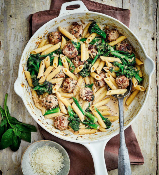Паста с брокколи и митболлами из колбасок в горчичном соусе