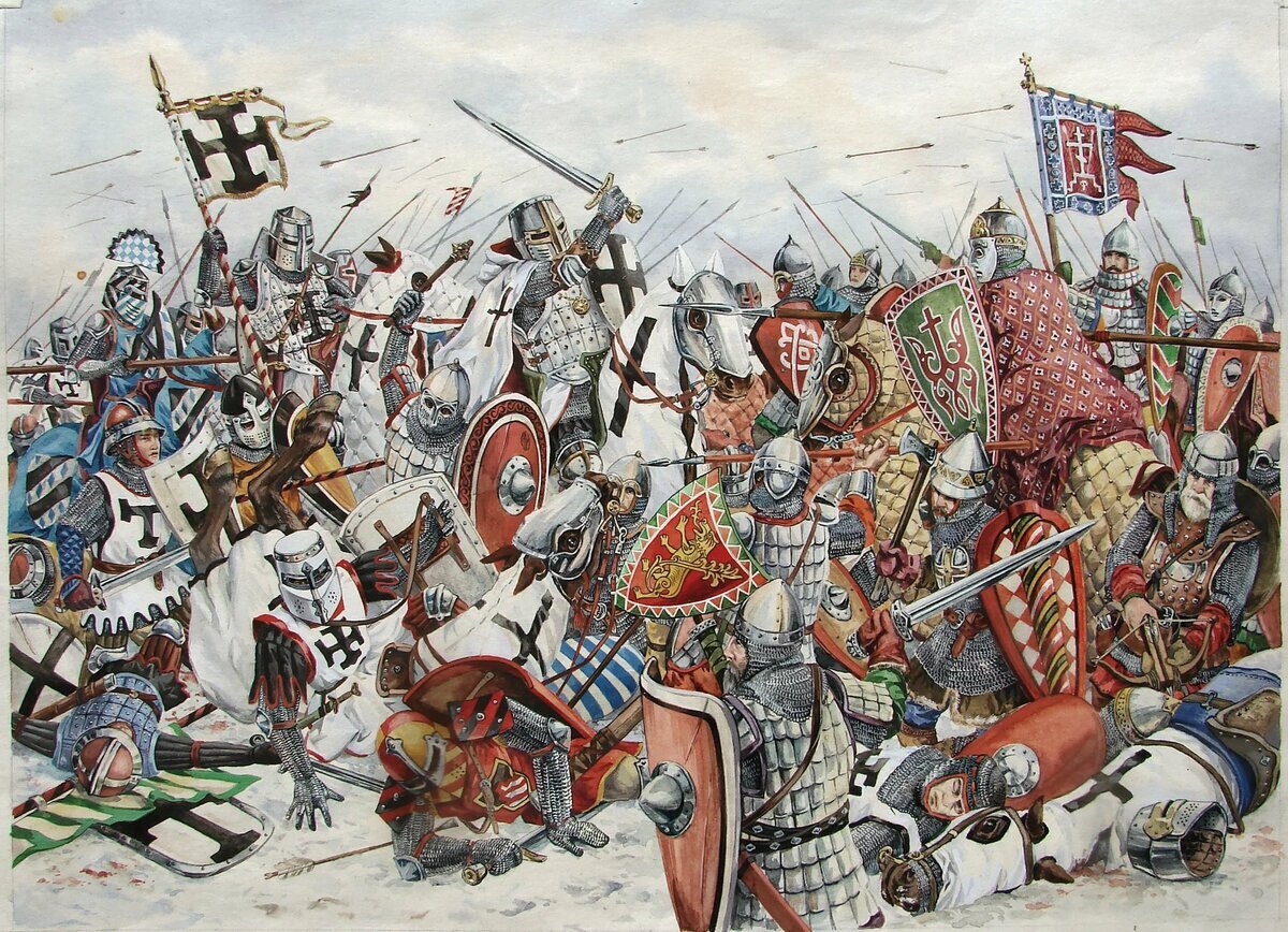 Как известно, крестоносцы Тевтонского ордена обычно использовали в качестве боевого порядка так называемую «свинью» или «кабанью голову» - длинную колонну, во главе которой находился клин из рядов наиболее сильных и опытных рыцарей. За клином шли отряды оруженосцев, а в центре колонны – пехота из наемников – выходцев из балтийских племен. По бокам колонны следовала тяжеловооруженная рыцарская конница. Смысл такого построения заключался в том, что рыцари вклинивались в строй противника, раскалывая его на две части, затем разбивали на более мелкие части, а уже потом добивали при участии своей пехоты.