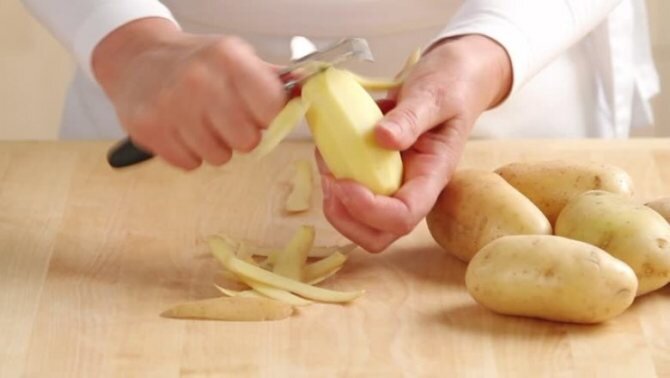 Соломка. Картофель нарезают сначала на кружочки или пластинки толщиной 1,5—2 миллиметра, а затем на полоски в виде соломки той же толщины.