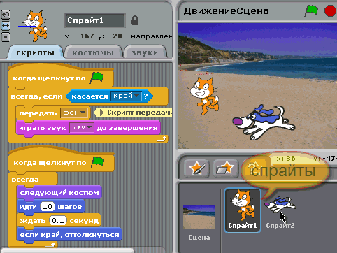 Scratch (Скретч) — визуальная объектно-ориентированная среда программирования для обучения школьников младших и средних классов. Название произошло от слова scratching — техники, используемой хип-хоп-диджеями, которые крутят виниловые пластинки взад-вперёд руками для того, чтобы смешивать музыкальные темы. Скретч создан как продолжение идей языка Лого и конструктора Лего. Скретч разрабатывается небольшой командой программистов для детей в Массачусетском технологическом институте. Программы на Скретче состоят из графических блоков, подписи к которым зависят от выбранного для интерфейса языка. Может быть выбран один из 50 языков интерфейса, включая русский. Интерфейс программы Какие исполнители алгоритмов есть в Скретче? В Скретче всего два класса исполнителей алгоритмов: сцена и спрайты. Что такое спрайт? У каждого спрайта есть имя и личные вкладки скриптов, костюмов и звуков, которые открываются в центральном окне, если щелкнуть 1 раз по эскизу спрайта под сценой. Вокруг активного эски