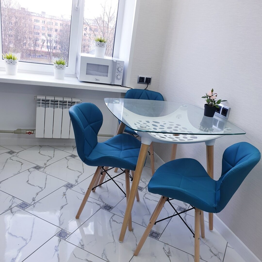 На кухне решили сделать акцент на кухонном гарнитуре — пастельные синие дверцы очень стильно сочетаются с натуральным деревом. Также удалось подобрать стулья, идеально вписывающиеся в интерьер кухни — они и красивые, и удобные. Плиточный пол, сделанный под мрамор, во-первых визуально не утяжеляет пространство, а во-вторых является идеальным выбором напольного покрытия для кухни, так как не требует никаких сложностей в уходе. В качестве дополнительных аксессуаров взяли горшки с растениями, потому что они выглядят свежо, но при этом не привлекают к себе лишнего внимания.