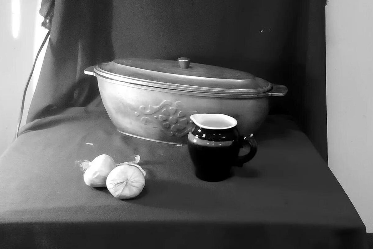 Что вы думаете, я развлекаюсь на карантине и самоизоляции? Не-е, выдохнуть некогда, одна работа! То новые шутки ИЗОизоляции посмотреть хочется, то домашнее задание давно пора выполнить. Домашнее задание - из второго класса художественной школы. Нас тоже перевели на удалёнку. И как хорошо в тишине дома заниматься, вы даже представить не можете! Итак, вот задание. Вот это всё надо изобразить в рисунке, то бишь карандашом. Утятница, молочник, чеснок, драпировка. :) Поехали! Вот набросок в первом приближении. "М-м-м", - на первый взгляд. "Мда-а-а", - на второй... :):):) Но что вышло, то вышло. Фотографирую, отправляю преподавателю. :) Получаю разбор полётов. Вот мои ошибки. :) Утятницу я изрядно... хм... деформировала. :) Даром что чугуний, мы его лёгким взмахом карандаша поломаем! :) Поправила вроде. Или нет? Ладно, не всё сразу. Начинаем штриховать. Сначала обозначу тени и самые тёмные пятна. О! А что, нравится! Фотографируем... Отправляем... Смотрим! Ха-ха-ха!!! Правый бок утятницы гор
