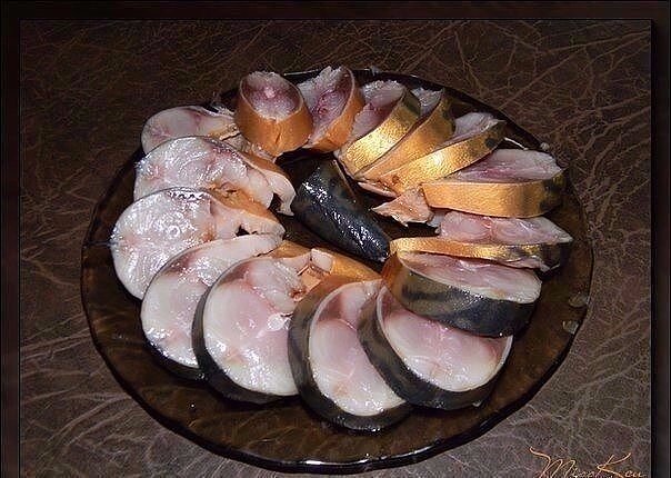Ингредиенты: - 2 шт скумбрии свежемороженой Рассол: - 1.5 л воды - 3 полных ст.л. с горкой соли - 1.5 ст.л. сахара - 2 ст. л. чая черного сухого - 2 полные горсти луковой шелухи Приготовление: 1. Готовим рассол. В кастрюле с водой растворим соль, сахар, чай сухой и тщательно вымытую луковую шелуху. Довести до кипения, накрыть крышкой и дать остыть. 2. Процедить. 3. Скумбрию почистить, удалить хвост и голову, промыть. 4. Подготовленную рыбу уложить в эмалированную или стеклянную посуду. 5. Залить рыбу готовым рассолом, накрыть крышкой и оставить при комнатной температуре на 3 дня. 6. Ежедневно, утром и вечером переворачивать скумбрию. 7. По истечении 3 дней вытащить рыбу из рассола, промыть под проточной водой. Для того, чтобы рыба была блестящей, смазать ее растительным маслом. 8. Для хранения лучше завернуть скумбрию в пергаментную бумагу и хранить в холодильнике не более 2-3 дней.