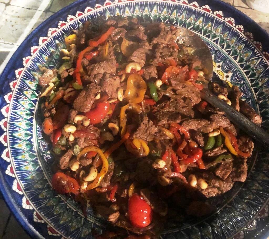 Весь процесс обжарки происходит на максимально сильном огне при постоянном помешивании либо шумовкой, либо подбрасывая ингредиенты на сковороде, (что всегда приводит зрителей в восторг).