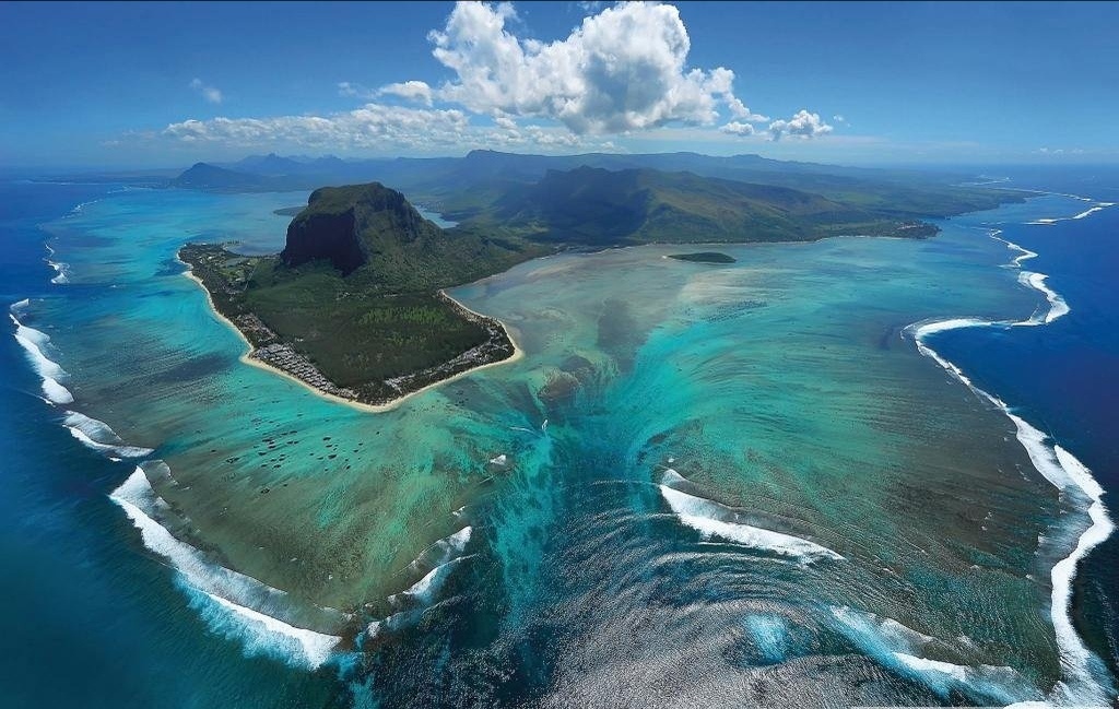 Завораживающее своей красотой необычное природное явление можно наблюдать в Индийском океане: каскады течений мощными потоками устремлены от поверхности воды вниз, в самые океанские глубины, образуя тем самым настоящий водопад под водой. Уникальный подводный водопад находится всего в нескольких сотнях метров от юго-западного побережья острова Маврикий, напротив полуострова Ле-Морн-Брабан. На самом деле подводный водопад в океане – всего лишь оптическая иллюзия, возникающая благодаря причудливым ландшафтом океанического дна около острова. Эффект водопада в океанских глубинах создается за счет сильных подводных течений, которые на фоне обманчивого ландшафта морского дна, образованного коралловыми рифами, намывом песка и отложениями ила, кажутся спадающими в океан бурлящими потоками. Возраст океанического шельфа в районе Маврикия насчитывает миллионы лет, однако океаническое дно здесь поднялось и создало плато относительно недавно. Глубина прибрежных вод Маврикия в основном колеблется в п