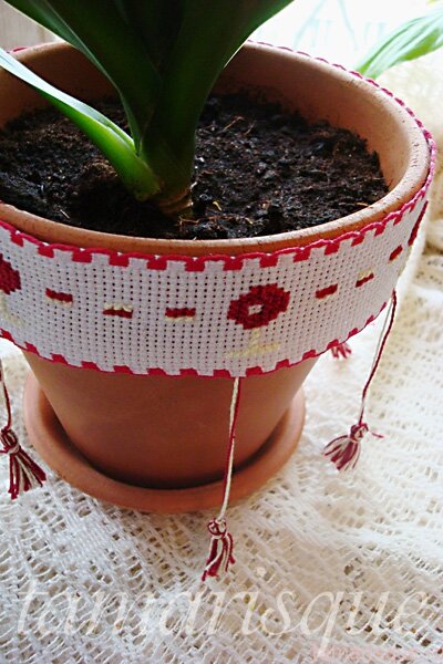Весной очень хочется чего-то нового. Душа просит свежих красок, идей побольше, цветов и солнца. Как правило, весной пересаживают в новые горшки комнатные растения, а сейчас, в режиме самоизоляции, найти и купить подходящий горшок бывает сложно. Мы, как всегда, находим выход из ситуации! Для пересадки растений можно сделать небольшую ротацию уже имеющихся горшков, заменить грунт, подобрать размеры и, конечно же, попробуем украсить! Для работы, собственно, потребуется керамический горшок (пластиковый наверное тоже можно, но я их никогда не покупаю, ибо не люблю), канва для вышивания, нитки Ирис, игла с крупным ушком, универсальный клей, ножницы и немного терпения. 1. Сначала нужно отмерить канву. Для этого просто оборачиваем ее вокруг горшка и отрезаем необходимый кусок. Ширина канвы должна быть чуть больше ободка выбранного горшочка, а если ободка просто нет, то сантиметров 5. 2. Далее вышиваем узор ниткам Ирис. Мудрствовать не нужно. Выбирайте самый простой, незамысловатый, чтобы он с