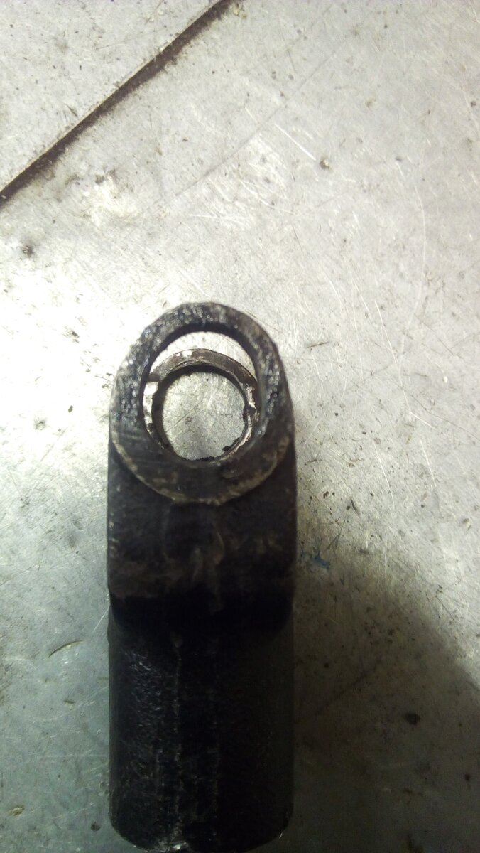 Замена крестовины рулевого карданчика. В нашем случае все было печальнее, крестовина у нас есть, а заменить её сложно. Она вывалилась не просто так. Как видите нижняя дырка в проушине круглая, а верхняя овальная. Это следы работы пряморуких умелых мастеров. Для сравнения, ровная дырка в верху. Я знаю как прессом из круга сделать овал, но не понимаю зачем
