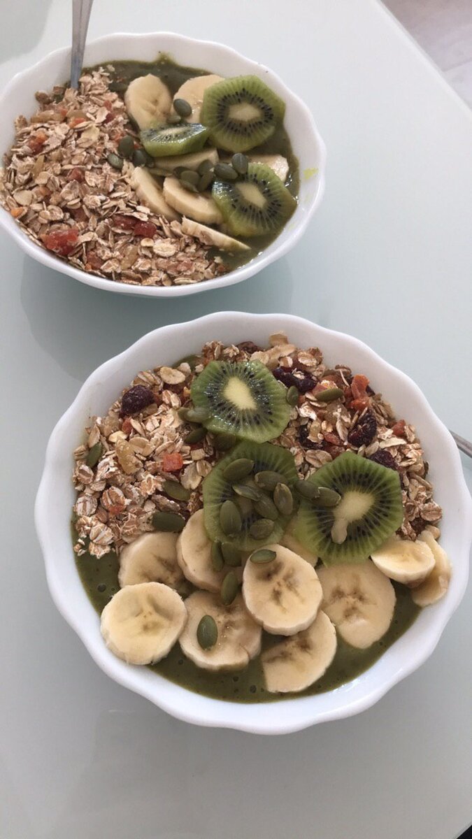 Смузи смузи смузи 🍓🥄 Кажется, что проще и разнообразнее ничего не может быть Создавай свои вкусы Смешивай всё, что есть в холодильник Экспериментируй 🤪 Но главный ингредиент банан, с ним смузи всегда будет густым Я предпочитаю смузи-боул для завтрака, особенно летом - самое лучшее! Просто смешиваю все ягоды и фрукты из холодильника, замороженные ягоды от бабушки 😂 Сверху добавляю немного ягод и гранолу, орешки, либо овсянку (но это реже) Если кратко Банан + ягоды/фрукты + молоко (овсяное, кокосовое и тд)/вода, но можно и без жидкости, если присутствуют замороженные продукты, всё в блендер и завтрак готов 🍓🍇🥥 Удобно с вечера приготовить, если утром рано вставать А с утра просто украсить гранолой, орешками Приятного аппетита!