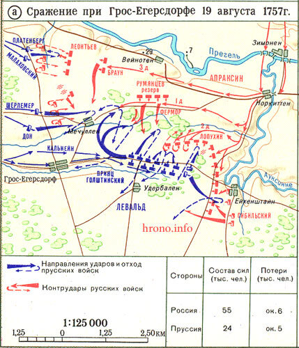 При этом в лесу оставалась масса незадействованных в сражении людей и пушек - в утреннем хаосе они так и не заняли каких-либо позиций. Весь потенциал своей армии Апраксин так и не реализует, хотя победа будет им достигнута. Бездействовал на поле боя корпус Сибильского - его сковывала большая группировка прусской конницы возле Удербалена. Там сконцентрировались части принца Голштинсокго, Шорлемера, Платена, черные гусары Рюша. Они прикрывали свою пехоту и угрожали нашей - во время маневра она была очень уязвима для кавалерии.