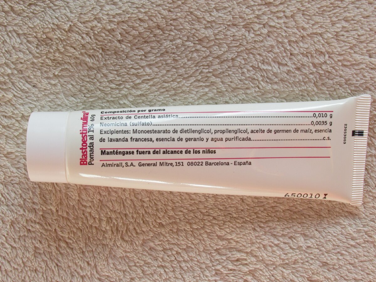 Так уж вышло, что в отпуске заграницей я получила травму лба - глупо и внезапно. Не вдаваясь в подробности скажу, что сразу стало ясно что повреждение кожи глубокое и в таких случаях, после заживления, остаются шрамы. Место травмы болело и отекло, ему требовалась, как минимум, дезинфекция и конечно нужно было посетить аптеку, чтобы купить необходимые средства. Вместе с антисептиком я приобрела и эту незнакомую мазь. Помню, что когда-то попадалась мне о ней информация, что хорошо ожоги лечит и порезы заживляет и всё что связано с нарушением кожных покровов тоже. В любом случае я ничего не теряла, приобретая её, кроме скромной суммы денег. Ни для одного, так для другого могло пригодится. Итак, испанская мазь Blastoestimulina имеет довольно простой состав: неомицин (сульфат) и центела азиатская. Это растение и ускоряет заживление посредством стимуляции коллагена. В Испании используется, в том числе, для лечения послеоперационных рубцов и на слизистых оболочках. Аналогов эта мазь не име