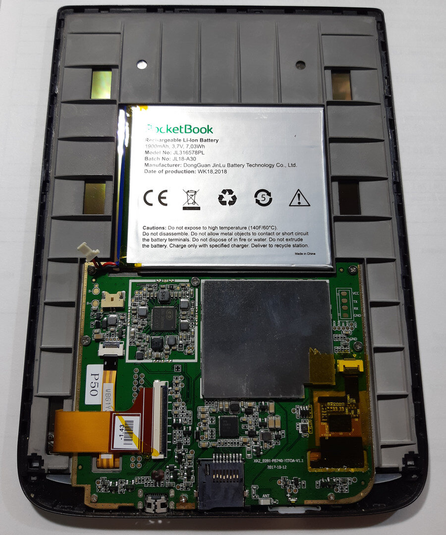 Что делать с разбитой книгой Pocketbook 740? Так уж случилось, что короновирус заставил многих людей сидеть дома и пережидать пандемию. Самым массовым и найболее увлекательным занятием в таком случае становится книга. Как же досадно когда она в самый неподходящий момент сломалась. Так случилось с нашим клиентом, точнее его книгой Pocketbook 740. Он обратился к нам за помощью и мы сделаем все, чтобы исправить сломанную вещь. Итак начинаем ремонт. Все кажется банально, разбираем, снимаем заднюю крышку и отключаем батарею, нам ведь не нужны возможные проблемы! Вот так книжка выглядит в разобранном виде.