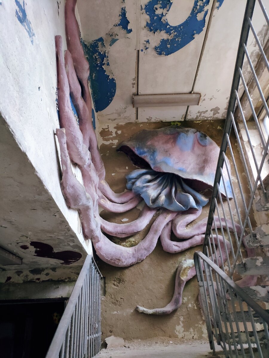 Продолжаем нашу прогулку по заброшенному пионерлагерю "Сказка". Первая часть здесь А сегодня мы заглянем внутрь жилых корпусов Лестничные пролеты просто эпичные! Гигантская медуза,монструозные... кораллы? Гидры? Иии... Ктулху, ты ли это? Не поворачивается язык назвать это нечто просто "раковиной". Миновав лестницы , можем осмотреться: Немного бытовых подробностей: Заглядываем в очередной темный угол... Выясняется, что место пользуется популярностью для проведения вечеринок — и выглядит это пугающе. И вот тут уже хочется сбежать на свободу. Кстати, вход и выход осуществляется через окно. Спасибо,что совершили этот поход с нами! Ставьте лайки,если было интересно 🦑