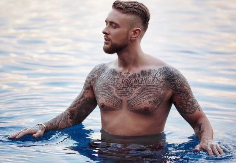 Грудь, руки и шея артиста украшены различными татуировками. Огромные крылья на фоне кирпичной стены, музыкальные ноты, изображение Майкла Джексона, сова с микрофоном, надписи «Never say never» и «Спаси и Сохрани» являются неотъемлемой частью личности певца.
