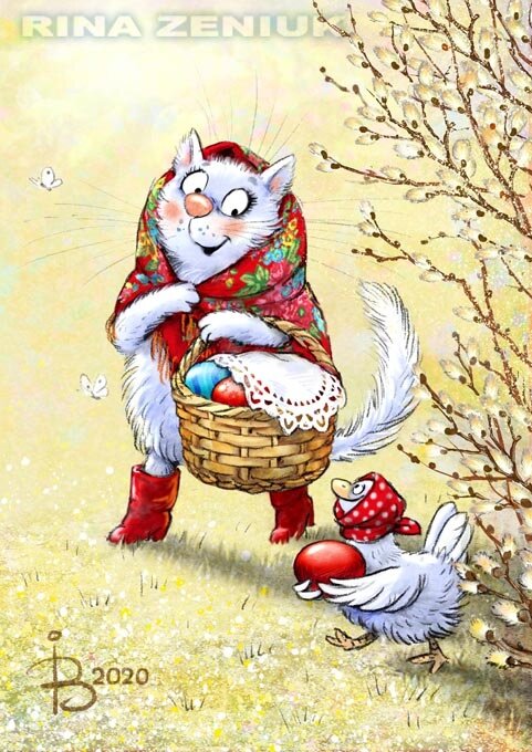 Застелить белые скатерти, Поместить в голове мысли светлые.. Ничего, что сейчас мы «взАперти», Есть конец у всего «беспросветного»... Расставить всё по-весеннему, Испечь куличи засветло.. И Великое светлое воскресенье Встретить радостно... Радость - «противоядие» сильное самое.. Противодействуй тоске и смятению... Это ничего, что временами мы слабые.. Зато легко в бою - спасибо «учению»... Достанем писанки мы да крашенки С близкими похристосуемся трижды.. Без малого камушка не построить башенки... Так что.. не кисни... Праздник великий.. светлый.. искренний.. Подними глаза в небо бескрайнее.. Молитвою да чистыми мыслями Исцеляй своё неизбежное и реальное.. Жизнь течёт, по своим законам.. Ей неведомы наши проблемы... Всё хорошо, если есть у тебя то, что зовёшь ты домом И в сердце.. немножечко веры... © Copyright: Оксана Зет, 2020 С благодарностью, автору стихов Оксане Зет за светлое настроение праздника! *** за позитивную Котоживопись - беларуской художнице Рине Зенюк! Радости, Ми