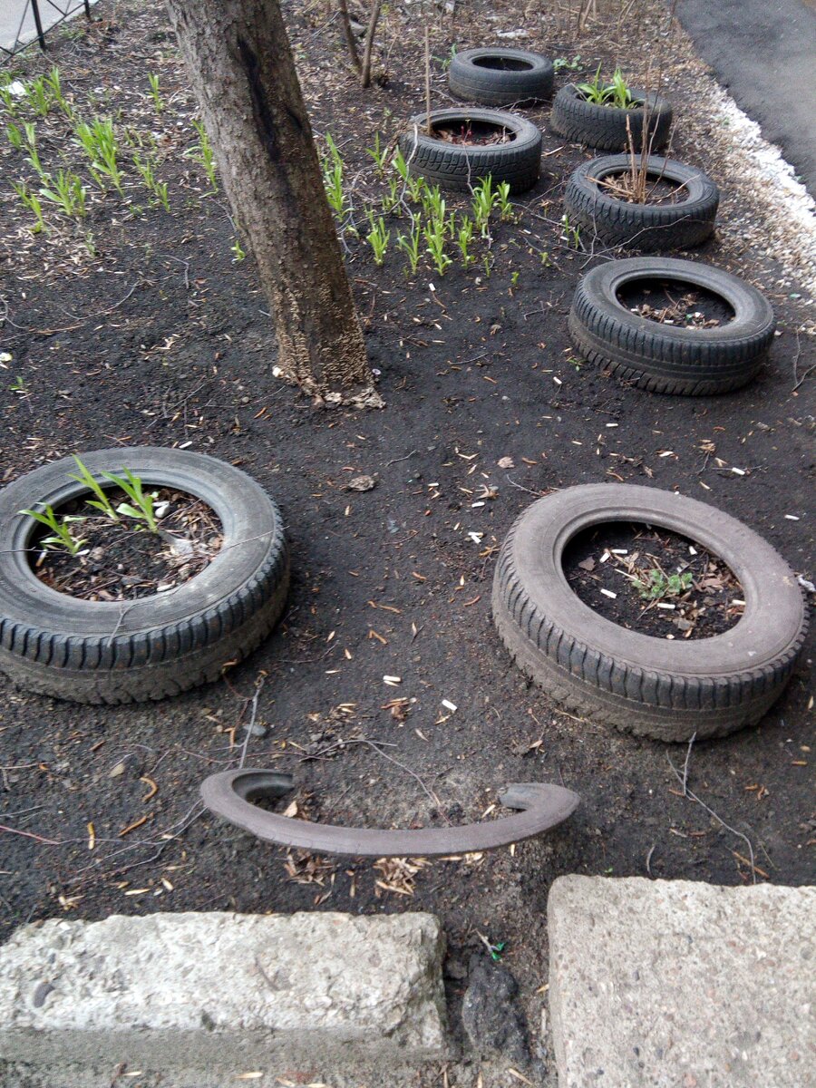 Прогуливаясь по дворам города, иногда впадаешь в ужас от увиденного... Почему-то у нас считается двор ухоженным, если есть поделки из шин от машин.... Принято считать, что такие "поделки" очень украшают внешний вид дворов...но на мой взгляд это как раз наоборот создаёт захламленность территории, создавая вид свалки. А недавно столкнулась с такой картиной...все деревья, которые росли возле дома, вырубили просто подчастую , а вместо них навтыкали шин, типа клумбы... Интересно, всем нравится вид этих шин, чем деревьев?... Конечно я понимаю коммунальщиков, которым не нужно убирать листву осенью , но вот жильцы....это же кислород, красота, естественность!!! Главное просто поддерживать порядок, а природа сама все сделает! А цветы можно сажать и так, травка сама вырастет, нужно только вовремя её подстригать. Конечно же шины оберегают газоны от незадачлевых автолюбителей, которых из грязи просто не вытащить, так и тянет туда... Тут хоть покрышки и спасают...про заборчики мы же и не слышал