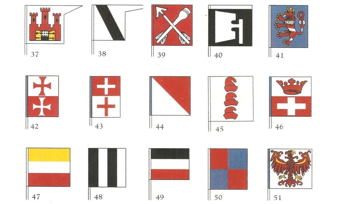 39. The Banner of the city of Mewe (a crossbow bolt and a bird blunt crossbow bolt argent). The unit was composed of the Teutonic Knights and the guest knights from Franconia (80 lances fournies). The commander: Komtur of Mewe was Komtur Segemunt von Ramungen, who died in the battle. 40. The Banner of the city of Heiligenbeil (sable, a broadax argent). The name of the commander is unknown. 41. The Banner of the city of Brunsberg (azure, a lion rampant queue forchee barry gules and argent, armed and crowned sable). The name of the commander is unknown. 42. The Banner of the Komturei of Elbing (per fess, argent and gules, two crosses patty (pattée) counterchanged). The unit was composed of Brothers and the militia from the suburbs of Elbing. The commander: Vizekomtur (Hauskomtur) Ulrich von Stoffeln. 43. The Banner of the city of Elbing (per fess gules and argent, two crosses couped counterchanged). The arms look like those of the Komturei of Elbing, but with the colors reversed, which