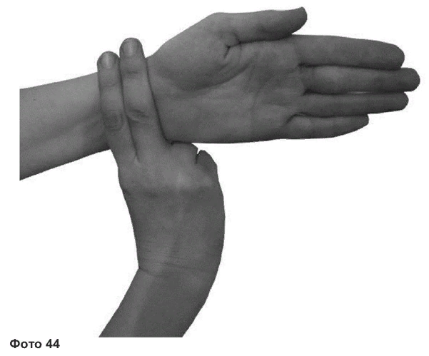 Самомассаж при сердечных болезнях и гипертонии Распирание в груди после нагрузки Для устранения напряжения, распирания в груди после нервной или физической нагрузки выполняйте такой массаж: 1. Правую ладонь плотно прижмите к груди: запястье лежит в центре груди, ладонь обращена влево (фото 43). Массируйте в направлении сверху вниз или круговыми движениями – по ходу часовой стрелки. Сделайте 200 круговых вращений или циклов «вверх-вниз». 2. Правой ладонью или полусжатым кулаком похлопывайте по области сердца: сначала движение должно быть легким, постепенно становясь все более весомым. Сила удара должна быть вам приятна. Всего до 200 хлопков. Акупрессура при аритмии Следующий акупрессурный прием используется при тахикардии (болезненное ускорение сердечного ритма), брадикардии (замедление ритма), экстрасистолии (небольшой сбой ритма). Для акупрессуры используется точка нэй-гуань («внутренний горный проход»), которая расположена на 2 цуня выше лучезапястной складки. Это расстояние лег