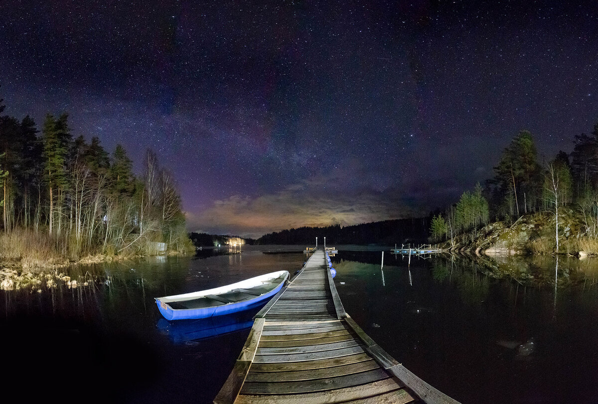 Всем привет! что то давно никаких уроков не публиковал, а интерес к ним есть. Поэтому разберу свежий снимок, сделанный буквально несколько дней назад. Апрельская звездная ночь на Ладоге. Луна еще не взошла, а белые ночи пока не наступили, поэтому над головой миллиарды звезд. И что необычно, довольно низкий млечный путь. Как обычно я использовал Canon. 6д +17-40 . Это панорамный снимок в 8 вертикальных кадров в два ряда. Я обычно дублирую raw джипэгом, так проще при просмотре, но это дело вкуса. В последнее время не брезгую задавать довольно экстремальные настройки камеры. Параметры съемки: iso 25600 f4, 5 секунд. Естественно при таком isoесть шум, но 6д первого поколения, делает его каким то приятным, я бы даже сказал аналоговым. Поэтому он совершенно не смущает , а наоборот придает картинке настроения. Открываем съемку в Лайтруме для склейки панорамы Не думал, что автоматика справится и сделает болванку, но все получилось легко. Делаю легкую коррекцию по цвету ,свету и тени.