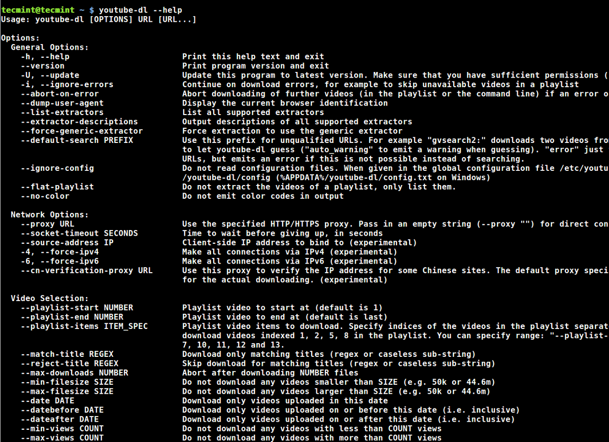 Youtube-dl имеет довольно обширную "help"страницу, и если вы хотите просмотреть ее, просто введите: