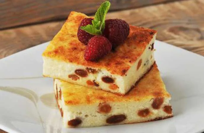 Ингредиенты для приготовления: творог (1 кг) яйца (5 шт.) сахар (200 г) сливочное масло (200 г) манная крупа (100 г) сода (щепотка) ванилин (на кончике ножа) В глубокую тарелку выкладываем творог, разминаем его вилкой. У меня были две творожные массы с изюмом и обычный творог, вот их я и смешала. Взбиваем яйца. Я использовала блендер – очень быстро и легко. Смешиваем яйца с творогом. Делаем это с помощью вилки, чтобы творог не превратился совсем в кашу, и сохранилась его зернистость в запеканке. В полученную массу высыпаем сахар. В этот раз я добавила его чуть меньше, так как использовала частично творожную массу, а она уже с сахаром. В отдельной чашке растапливаем сливочное масло. Я ставила его в духовку на несколько минут, т.к. она уже разогревалась для выпекания. Выливаем растопленное масло в нашу творожную массу. ОБЯЗАТЕЛЬНО всыпаем манную крупу, иначе запеканка получится жидкая. Я всегда добавляю изюм, предварительно замочив его в кипятке. Бросаем щепотку с