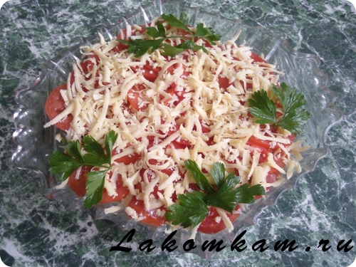Уложите салат слоями: листовой салат залейте майонезом с чесноком, затем крабовые палочки, затем кружочки помидоров и сверху посыпьте тертым сыром.