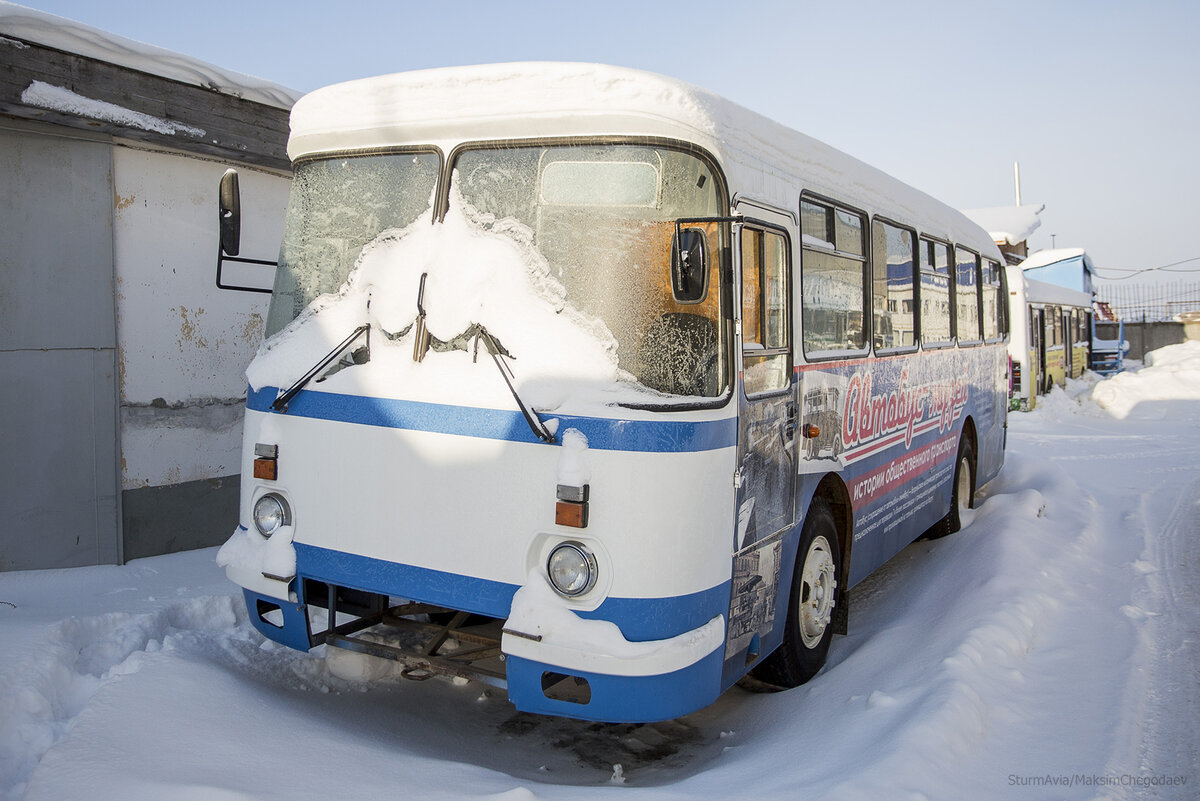 В начале года мне удалось в Тобольске поймать легендарный автобус ЛиАЗ 677 м, но как оказалось в Тобольском ПАТП стоит еще один, конечно помоложе, но тоже интересный труженик советской эпохи ЛАЗ-695Н.