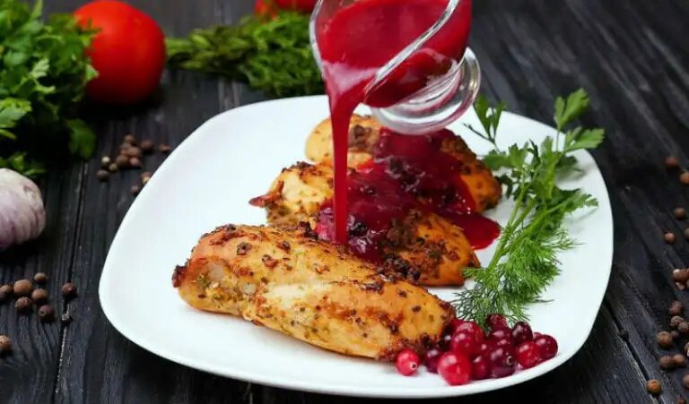 Маринованное в специях куриное филе запекается в духовке и подаётся с прелестным кисло-сладким клюквенным соусом, который идеально сочетается с белым мясом птицы и наделяет кушанье совершенно особенным праздничным вкусом.