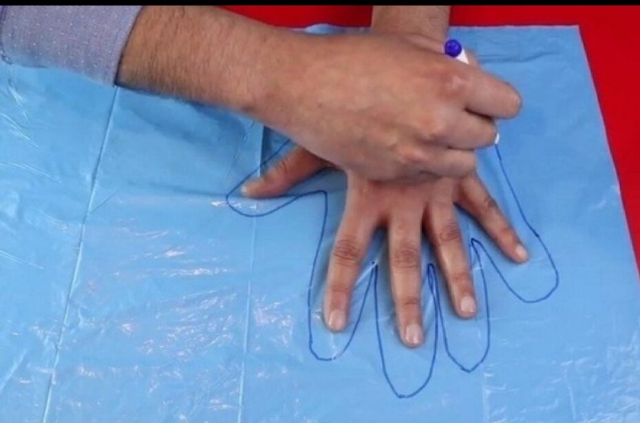 Учимся делать одноразовые перчатки Это очень просто Можно взять бесплатный пакетик, обвести на нем руку, нагреть нож и обвести пакет. Таким образом пакет и с клеится.