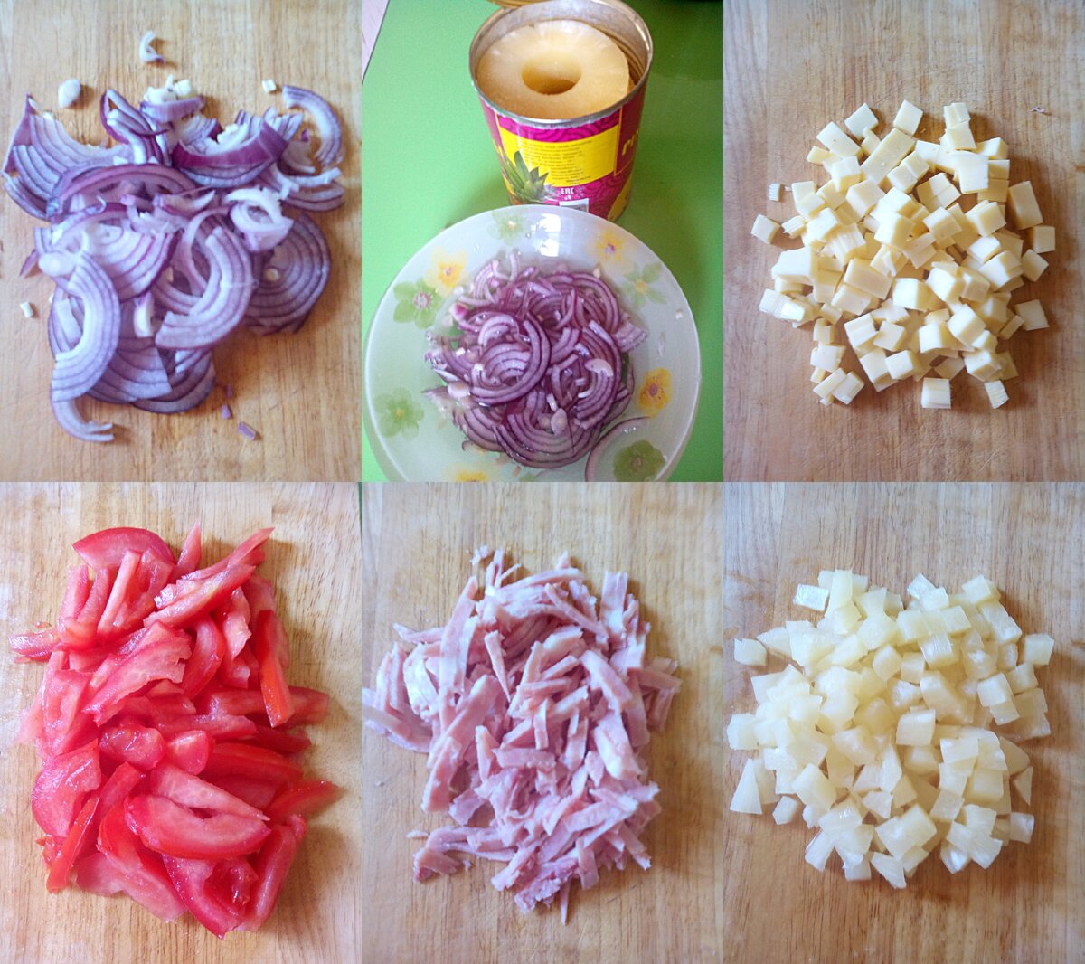 Для тех, кто любит поэкспериментировать и кому знакомо понятие фьюжн. Этот салат готовлю на праздники всегда. Главное - накануне купить все необходимые продукты, чтобы потом быстро все нарезать и соединить. Вам потребуется: Все составляющие салата, а именно - ветчина, сыр, помидор, ананасы берем в равных долях. В граммах, конечно, не взвешиваем, а определяем на глаз. Для начала чистим лук, режем полукольцами. С консервированных ананасов сливаем сироп и отправляем в него лук мариноваться. По времени ровно на столько, сколько вы будете нарезать остальные составляющие. Ветчину - соломкой, сыр и ананасы - кубиками. У помидора убираем семена и нарезаем тонкими дольками. Соединяем все ингредиенты в любой последовательности, не забываем про маринованный лук, отжимаем его от сока ананаса, добавляем к остальным продуктам и все аккуратно перемешиваем. А непосредственно перед подачей сбрызгиваем лимонным соком и заправляем майонезом. Майонеза добавляем самую малость, чтобы он смешался с е