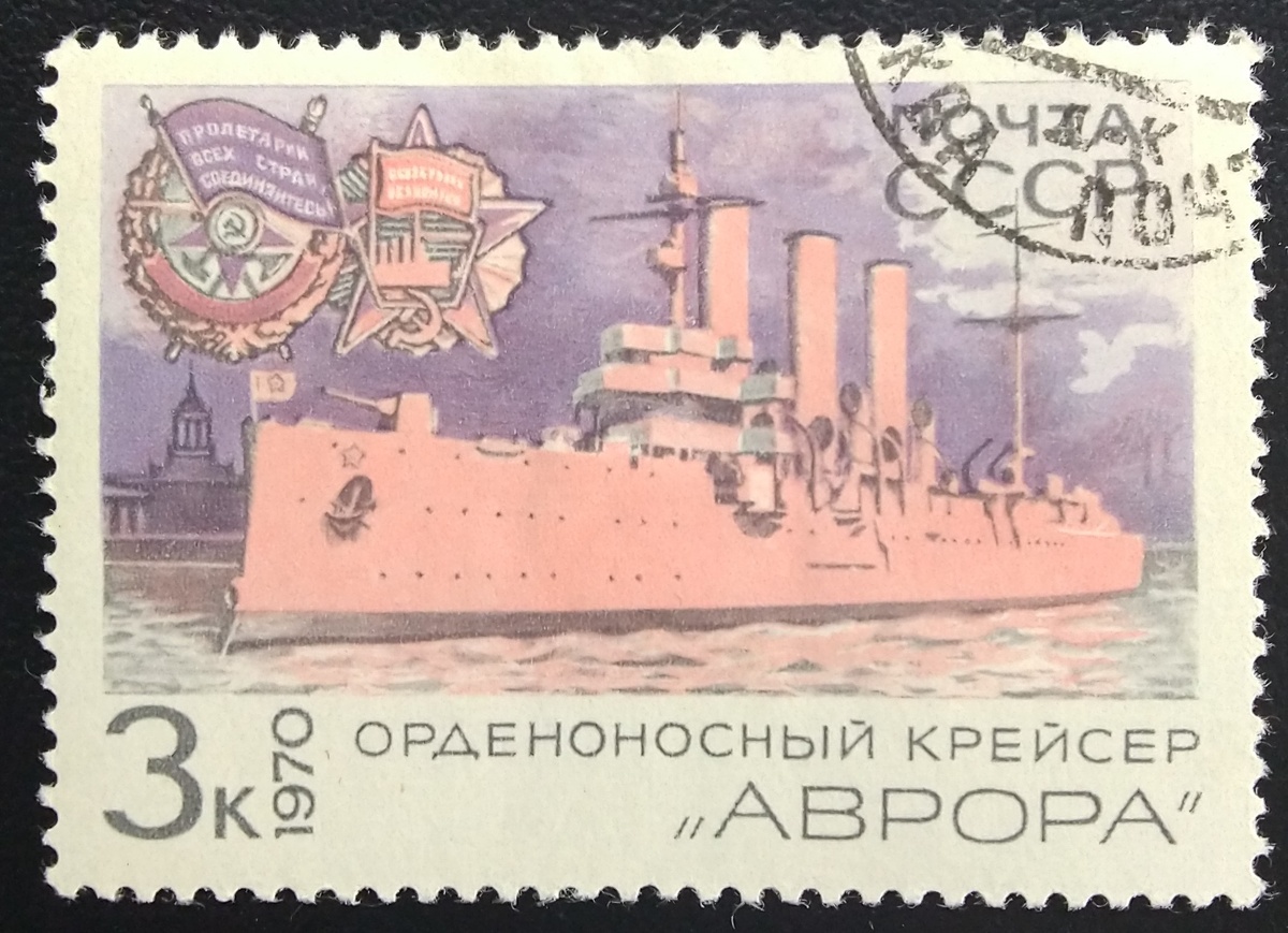 История отечественного кораблестроения в миниатюрах, на почтовых марках СССР 1970 года выпуска, глубокая печать, рисунки В. Завьялова, №№ 3909 – 3912. Орденоносный крейсер «Аврора» - был спущен на воду в мае 1900 года и введен в эксплуатацию три года спустя. Назван в честь одноименного парусного фрегата, прославившегося при обороне Петропавловска-Камчатского во время Крымской войны, в 1854 году. Вооружение: 42 пушки четырех различных калибров, три торпедных аппарата. Водоизмещение - 7130 тонн, толщина брони - от 63,5 мм на палубе до 152 мм - на рубке, дальность хода - 4000 морских миль, экипаж - 570 человек, в том числе 20 офицеров. Длина 126,8 метров, ширина - 16,8 метров, глубина осадки - 6,4 метров. Ракетный крейсер «Грозный» - спущен на воду в марте 1961 года. За время службы находился в составе Северного, Черноморского и Балтийского флотов. После распада СССР, в 1991 году, был разделан на металл. Водоизмещение - 5315 тонн, длина - 142,7 метра, ширина - 15,2 метра, осадка - 4,7