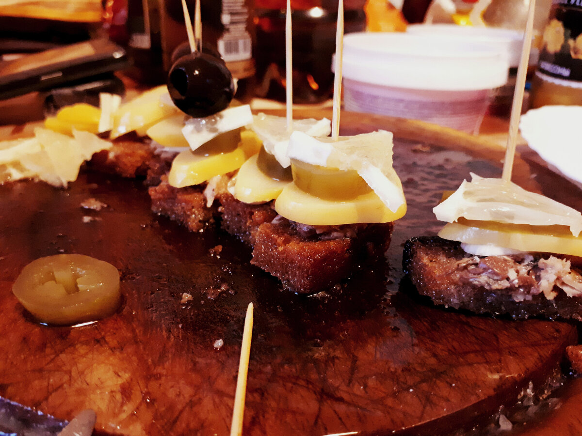 Все просто)) обжариваем черный или серый хлеб, натираем чесноком, режем на маленькие кусочки, далее выкладываем рыбную консерву - у нас подкопченая иваси, потом тонко нарезанный чеснок, далее кусочки маринованных патиссонов, кусочки перца халапенью (тоже консервированный) и завершает все кусочек лимона. Можно по желанию сверху еще насадить оливку. Нам эта идея очень понравилась, сочетание соленого, жгучего и кислого прекрасно))) Приятного аппетита. У кого есть еще идеи как улучшить данную закуску - добро пожаловать в комментарии.