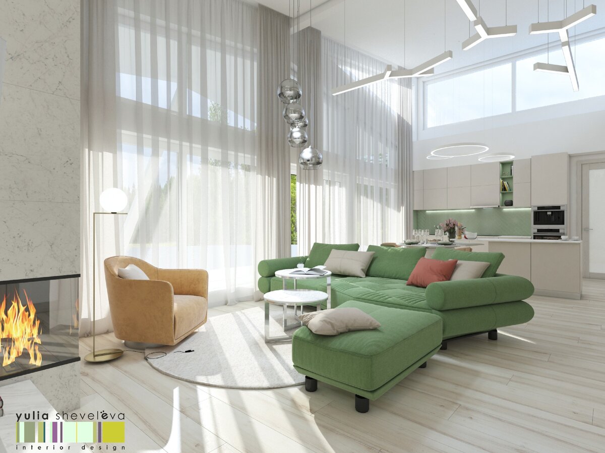 В просторной гостиной яркий и красивый диван, цвета майской зелени. Напротив - камин, облицованный керамической плиткой «под мрамор». В помещении высокие потолки, в результате в комнате создается очень просторное и комфортное пространство. Огромные панорамные окна наполняют интерьер естественным светом, а легкий текстиль добавляют тепла и уюта. Помимо основных окон, по периметру у потолка размещены дополнительные окна.