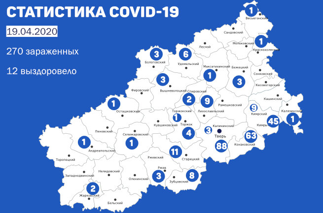 Таким образом, по состоянию на утро 19 апреля число заболевших COVID-19 в Тверской области достигло 270 человек. Больше всего заразившихся в Твери – 88 (+7) человек, Конаковском районе – 63 (+14) человека и Кимрах – 45 (+1) человек. Напомним, что 12 заболевших уже выздоровели. «258 зараженных изолированы, находятся под постоянным наблюдением медиков или получают необходимое лечение», – сообщил оперативный штаб по предупреждению завоза и распространения коронавирусной инфекции в Тверской области. К настоящему моменты на коронавирус в Тверской области обследовано 14 тысяч 570 человек, в том числе за последние сутки – свыше 993 человек. По данным сайта стопкоронавирус.рф на утро 19 апреля, за последние сутки в России коронавирусная инфекция обнаружена у 6 тысяч 060 человек. Таким образом на сегодняшний день в России выявлено 42 тысяч 853 случая COVID-19. При этом 3291 зараженный выздоровел, 361 умер. Распространение коронавируса на территории Тверской области Тверь - 88 (+7) Конаковский